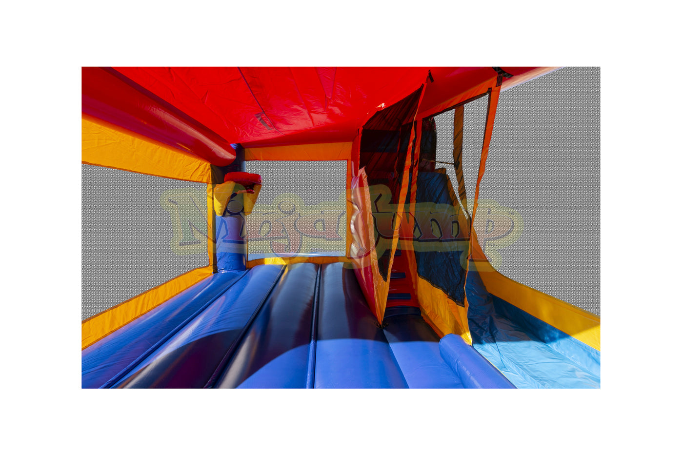 This 4-feature challenge is jam-packed with fun, offering a generous area of jumping area, basketball hoop, climb and slide.