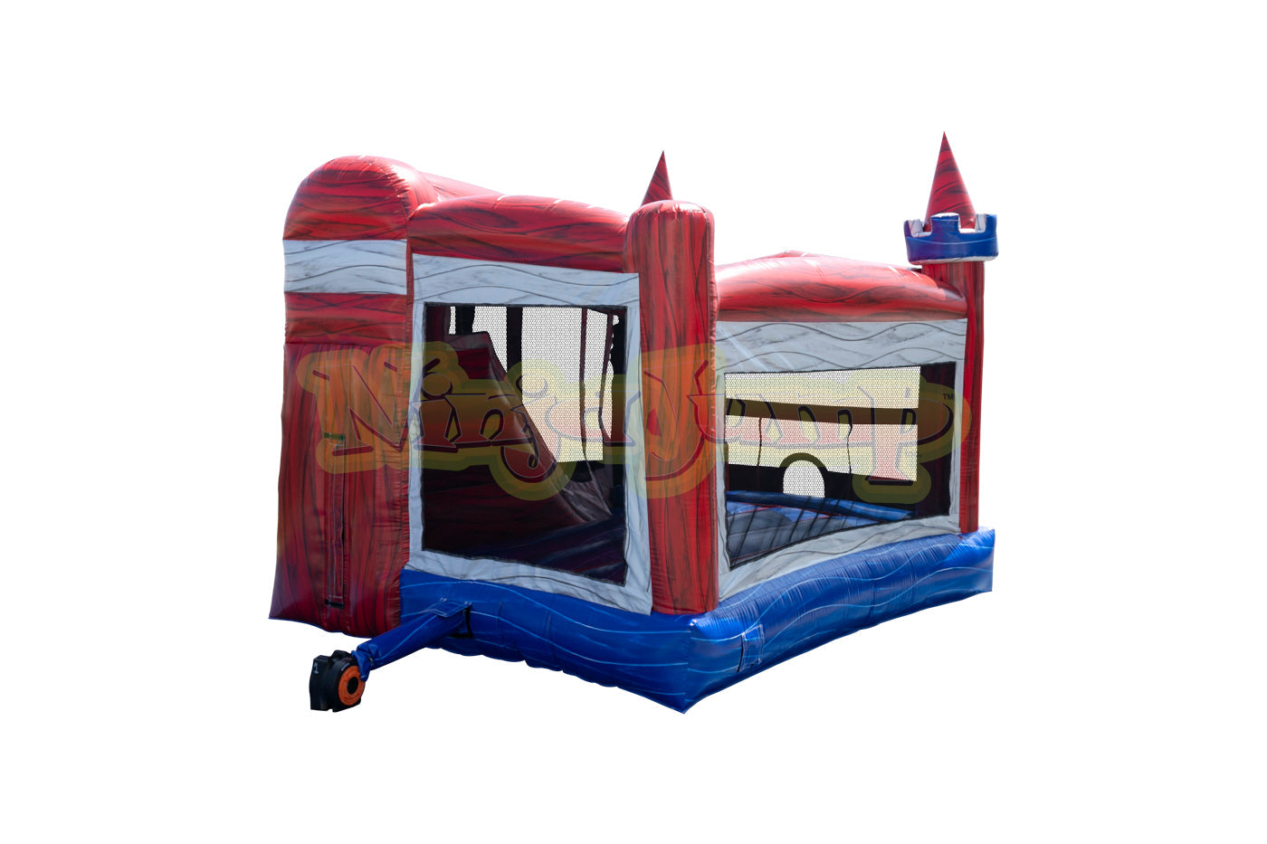 This 4-feature challenge is jam-packed with fun, offering a generous area of jumping area, basketball hoop, climb and slide.