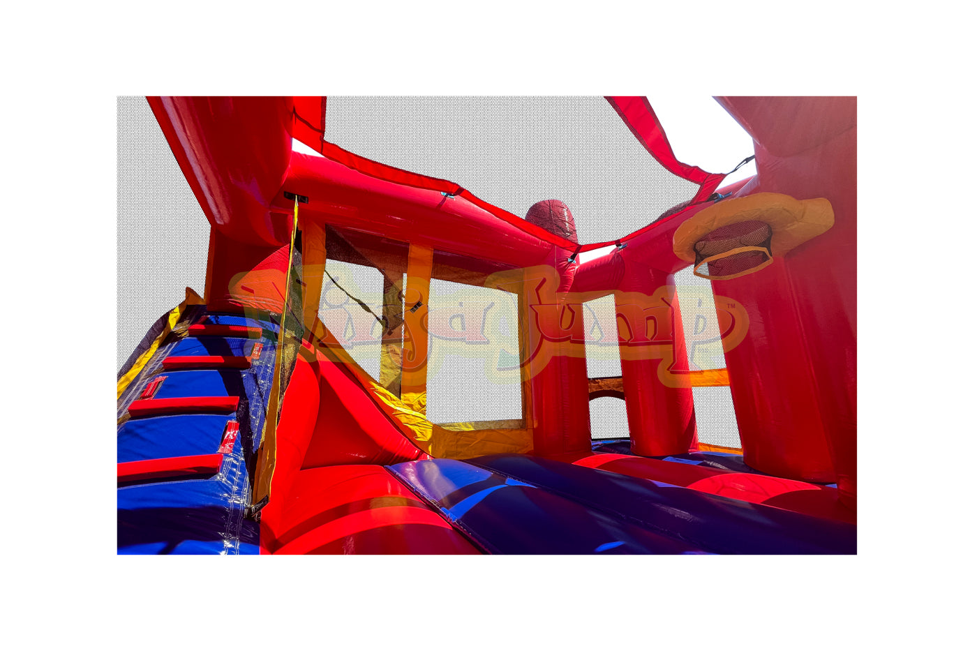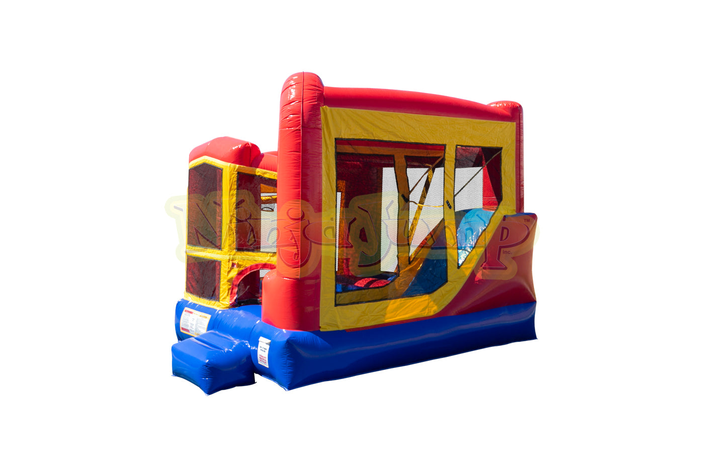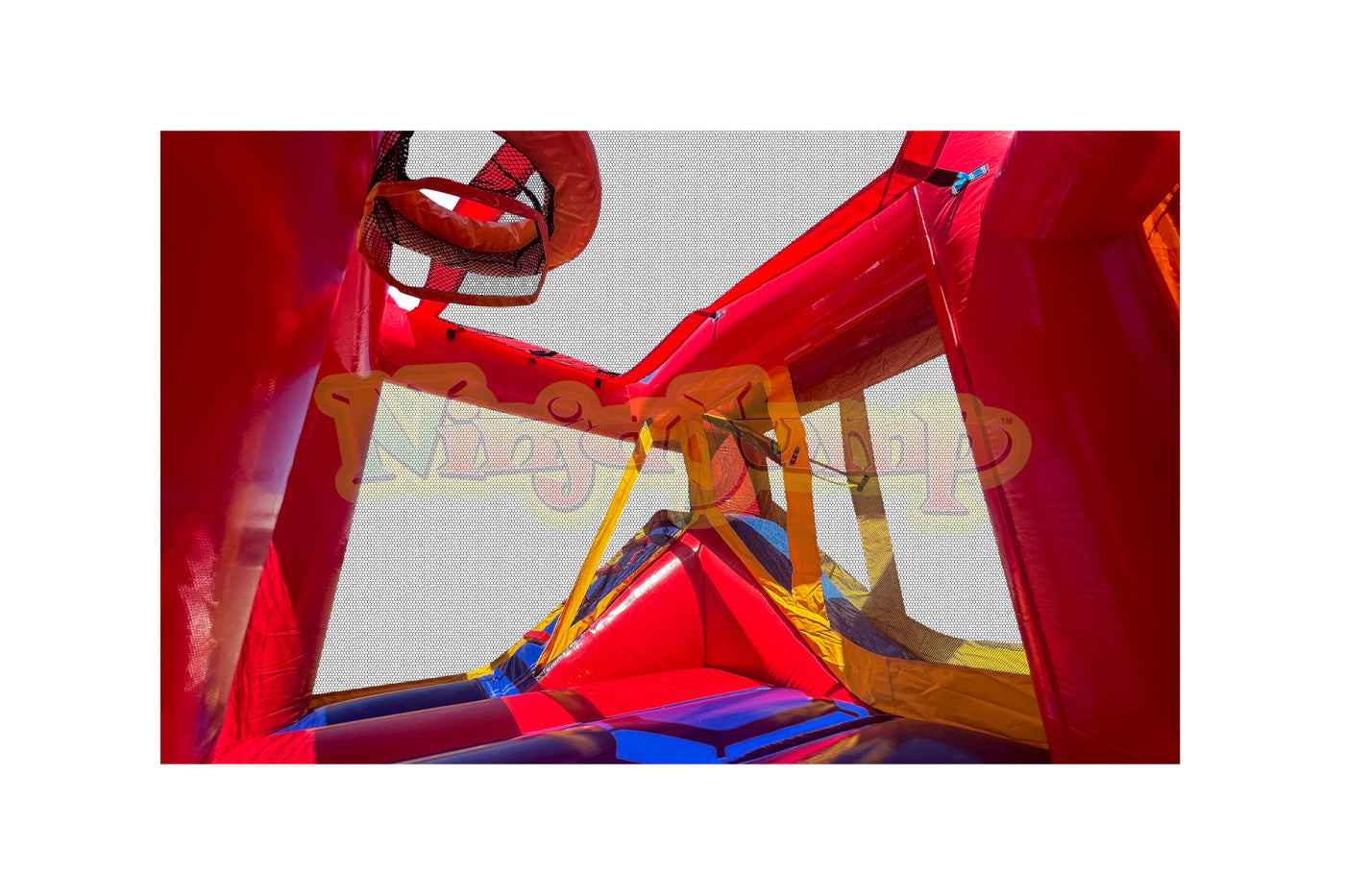 The Backyard combo style bounce house is the ultimate in inflatable jumpers! The large interior jumping area offers a basketball hoop. This bouncy castle has a climb feature and a convenient exit slide for hours of active fun! Parents and spectators are offered a clear view with the 360-degree mesh sides of this moonwalk. The Backyard combo bounce house is made of lite n strong™ fire-resistant vinyl for safety, durability and easy portability. This Backyard bouncy house is sure to make any indoor or outdoor event a great success!