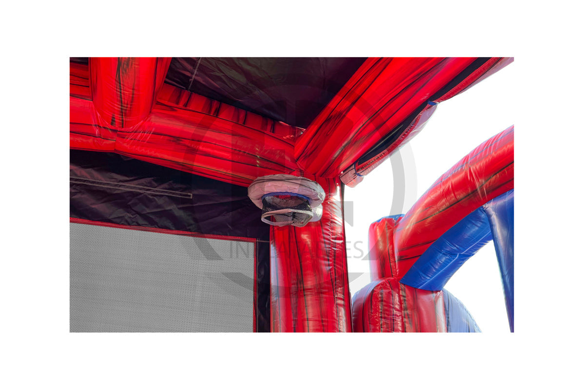 D) No Warranty is provided by EZ Inflatables, Inc. on Zippers, Netting, Mesh. The warranty shall apply to your inflatable plus all accessories, equipment and parts manufactured by EZ Inflatables, Inc.. Wear covers such as entrance covers or mats and slide covers with steps are not warranted beyond the first 90 days after buyer receives the order. These covers are intended to reduce wear on the inflatable and require periodic replacement. A product shall not be considered defective if it is a different color than shown in EZ Inflatables, Inc. catalog and/or website, and no warranty is made relating to color, digital printing or any airbrushing done on any unit. All requests of buyer for all warranty work and replacement are subject to product inspection at EZ Inflatables, Inc. factory in Glendale, California. Ordinary wear and tear will not invalidate EZ Inflatables, Inc. limited warranty, but misuse, improper handling or storage, improper repairs, improper maintenance and care, lack of ground cover under inflatable, or accidental, abusive or negligent treatment of the product will invalidate EZ Inflatables, Inc. warranty. Buyer must use stakes and all tie-down tethers at all times to insure the safety of users and the equipment. This warranty is not a guarantee that the product, will not through use, handling and storage, develop tears or punctures from time to time; the repairs of which are the responsibility of Buyer. Buyer pays a shipment cost to EZ Inflatables, Inc. for repair, and EZ Inflatables, Inc. pays the shipment cost to the Buyer after it has been repaired. No statement, remark or representation of any employee or agent of EZ Inflatables, Inc. may vary this Limited Warranty unless in writing and signed by the President of EZ Inflatables, Inc.. - Other Equipment (not manufactured by EZ Inflatables, Inc.): No warranty of any kind is extended by EZ Inflatables, Inc. but EZ Inflatables, Inc. will, to the extent it can legally and contractually do so, assign to Buyer, at Buyer's request, all warranties on such other equipment, if any, offered by the manufactures or suppliers of such other equipment. The fan motor supplied with your inflatable is covered by the blower manufacturer's own warranty. Any claims of defect in the blower operation must be directed to the blower manufacturer directly for repair or replacement. In case of defects in materials, workmanship or defects arising from the selection of material or procedures of manufacture, such defects must become apparent in the inflatable, equipment or part within 24 months of shipping. The extent of seller's liability under this warranty is to defects in material or workmanship. Defects arising from the selection of material or the processes of the manufacture are limited to the repair of such defects or to the replacement (with item free from the defect in question) of any accessory, equipment, or part which is defective in any of such respectswith the exception of color fading. The extent of seller's liability under this warranty as to defects inherent in design is limited to the correction at our expense of all such defects becoming apparent in the inflatable accessory , equipment or part purchased here within one year of use. Seller is not responsible for any lost revenue as a result of a warranty claim by buyer. Seller is not responsible for replacing any inflatable product as a āLOANERā product during a repair of a warranted product. If a āLOANERā product should be available during the repair, buyer will be responsible for all round trip shipping charges and any damages caused to the inflatable supplied. Seller shall make all such repairs, replacements and corrections with care. This warranty shall become void if inflatable is packed wet or repaired by any other repair agency not approved by EZ Inflatables, Inc..