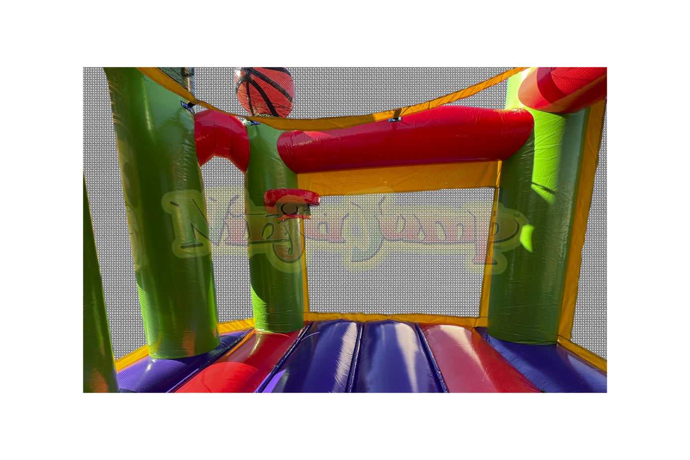 The Backyard combo style bounce house is the ultimate in inflatable jumpers! The large interior jumping area offers a basketball hoop. This bouncy castle has a climb feature and a convenient exit slide for hours of active fun! Parents and spectators are offered a clear view with the 360-degree mesh sides of this moonwalk. The Backyard combo bounce house is made of lite n strong™ fire-resistant vinyl for safety, durability and easy portability. This Backyard bouncy house is sure to make any indoor or outdoor event a great success!
