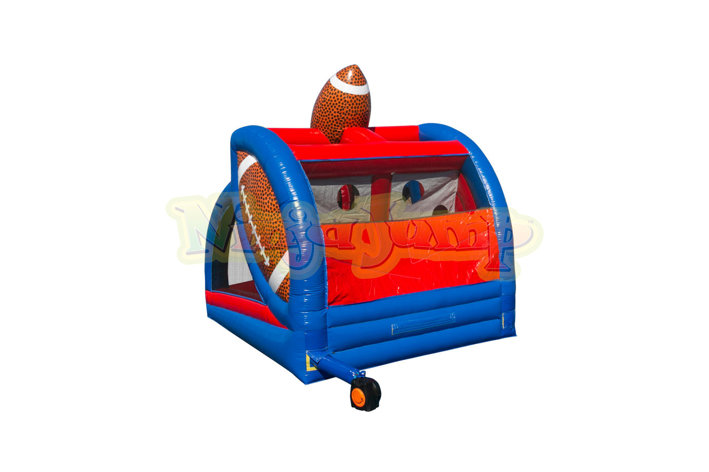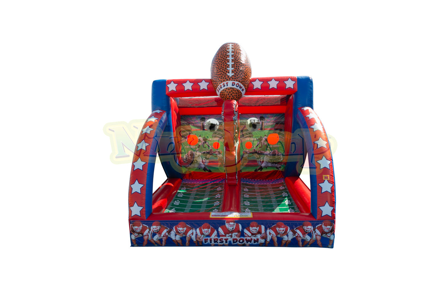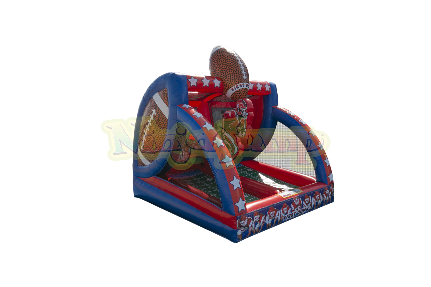The First Down from Ninja Jump is an exciting inflatable game that lets players young and old show off their passing game. Future quarterbacks can face off with each other, as they throw the football across the field to the back wall that holds a line of receivers. Once the pass is completed, the football then is returned to the opposing quarterback's lane. The competitive spirit of this inflatable game really gets going as each player tries to get rid of all of their footballs. Each First Down inflatable game features linebacker and receiver artwork, along with a simulated football "field" and three-dimensional footballs at the top of the unit. The First Down inflatable game is a great way to promote exercise, healthy competition and sportsmanship, and is a fun addition to any birthday party or event for guests of any age. This inflatable football game will attract future football stars to any FEC or outdoor party! Our exclusive line of games are made safe and secure with lite n strong™, fire-resistant vinyl making it safer, portable and more durable.