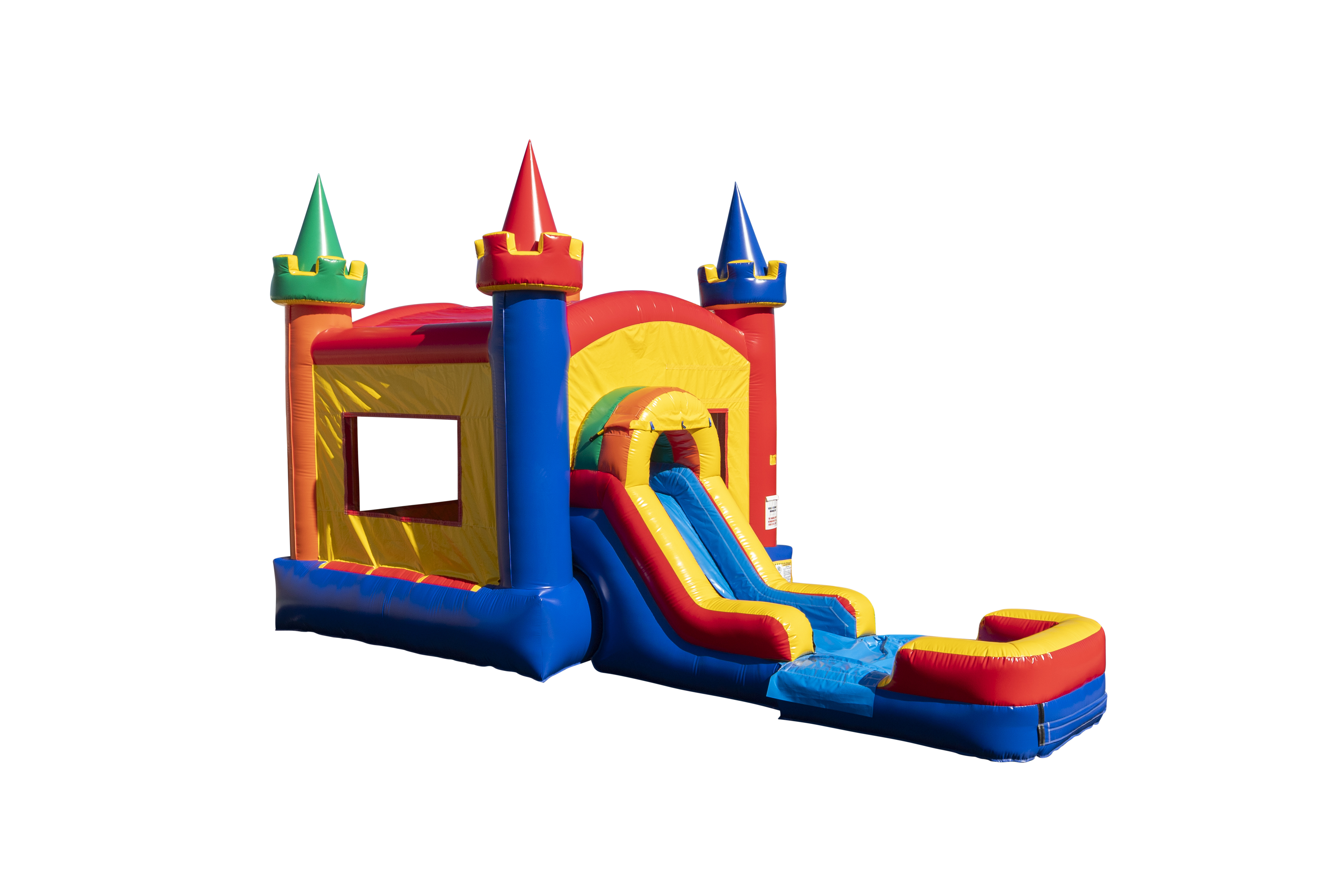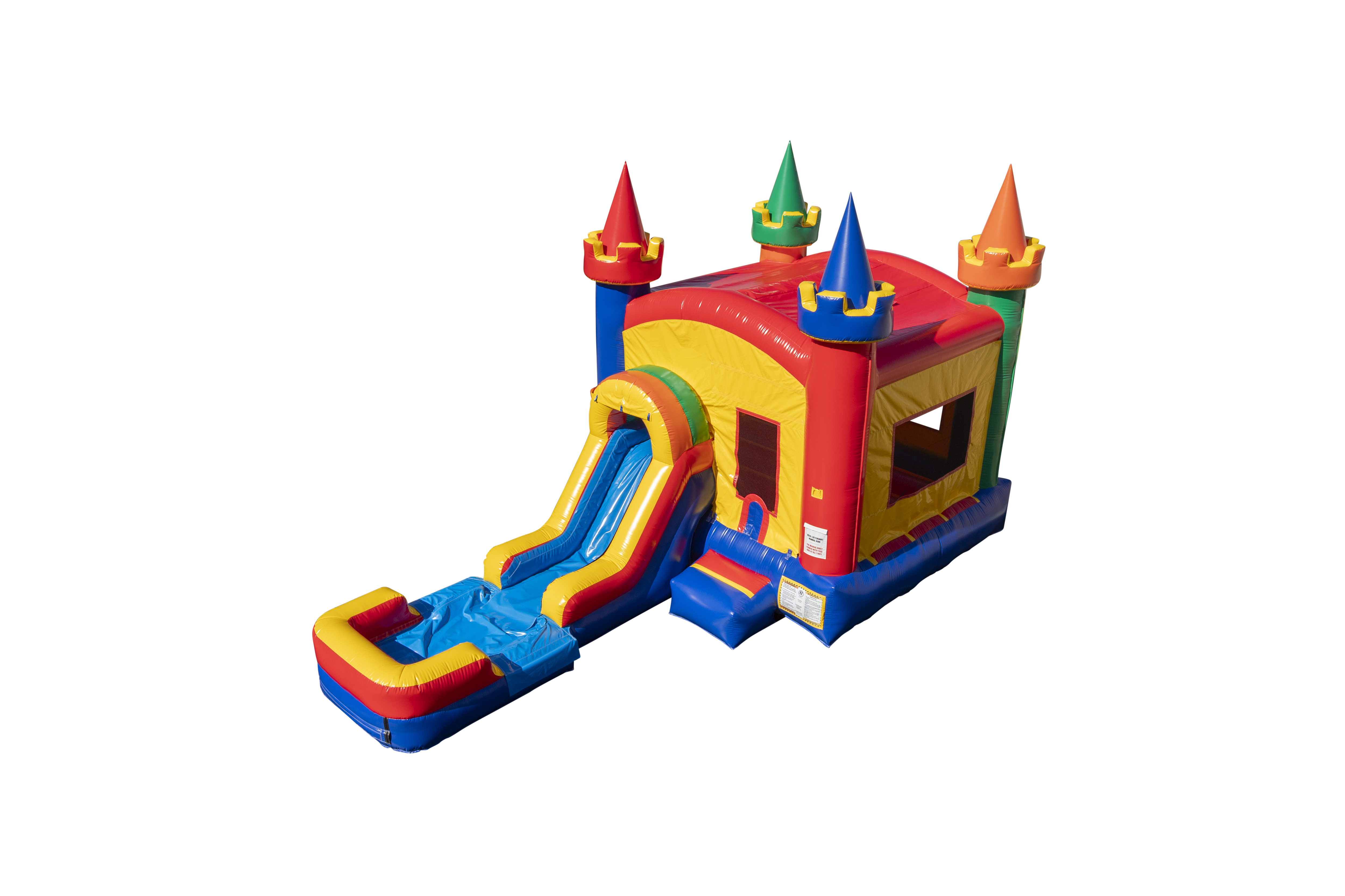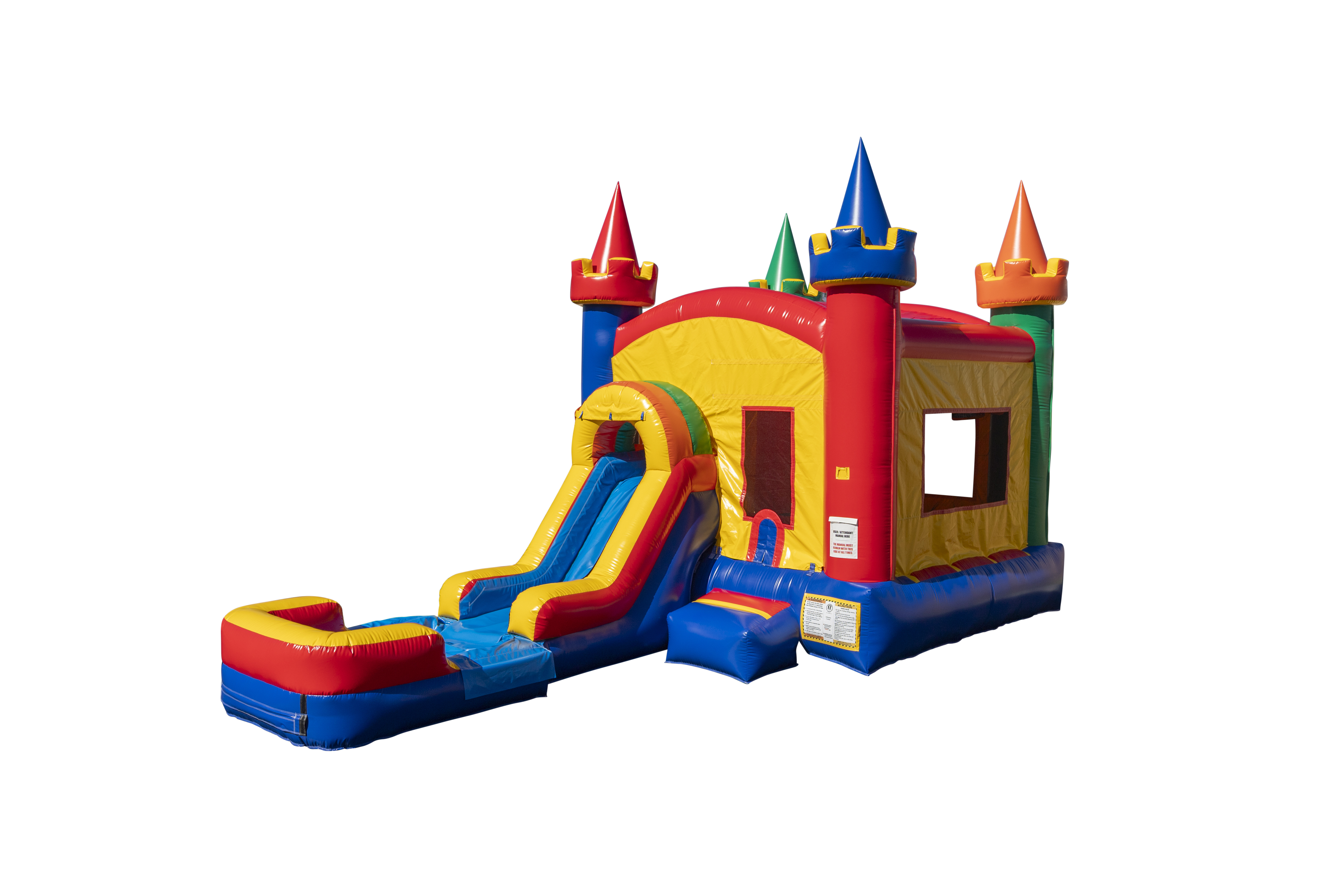 The Castle Rainbow IP SL EZ Combo-CEZ-IP10 is for all the thrill seekers ready to explore, jump in the large bouncer area, show off your skills on the basketball hoop and climb up the stairs to slide in to the pool.